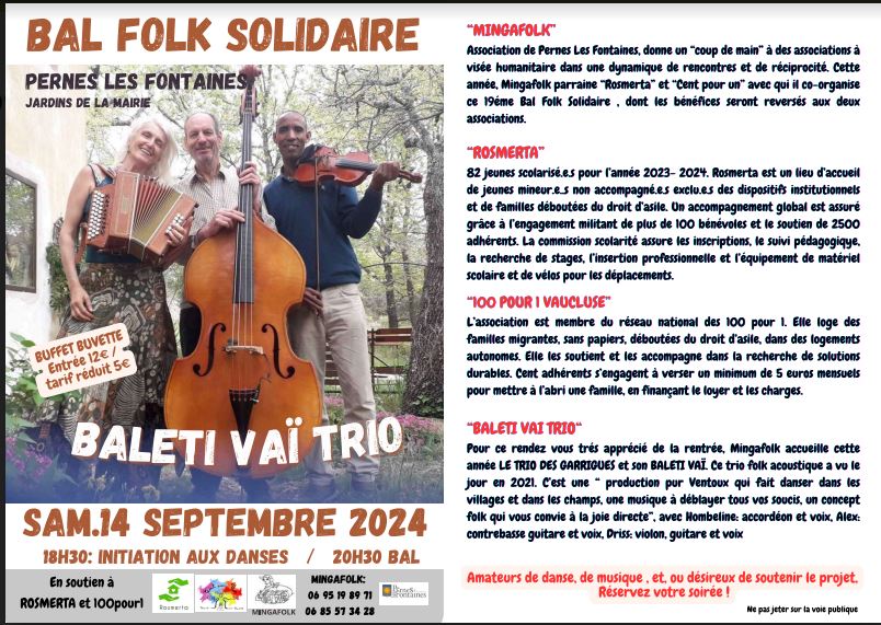 En soutien à CENT POUR UN VAUCLUSE et ROSMERTA AVIGNON MINGAFOLK vous convie au BAL FOLK Solidaire avec BALETI VAÏ TRIO